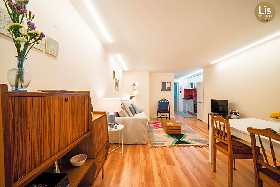 This new apartment is located on the ground floor of a characteristic Portuguese building. It has a small patio with outdoor furniture.